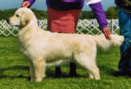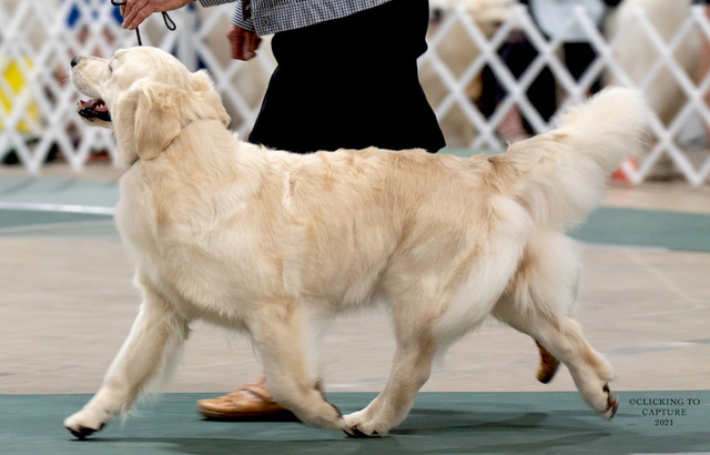 Pink is a very cute, personable dog. She has beauiful movement, correct head and rock solid topline. She has consistently been admired by judges who will look at and consider very light goldens, including several breeder judges.