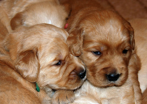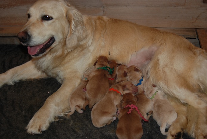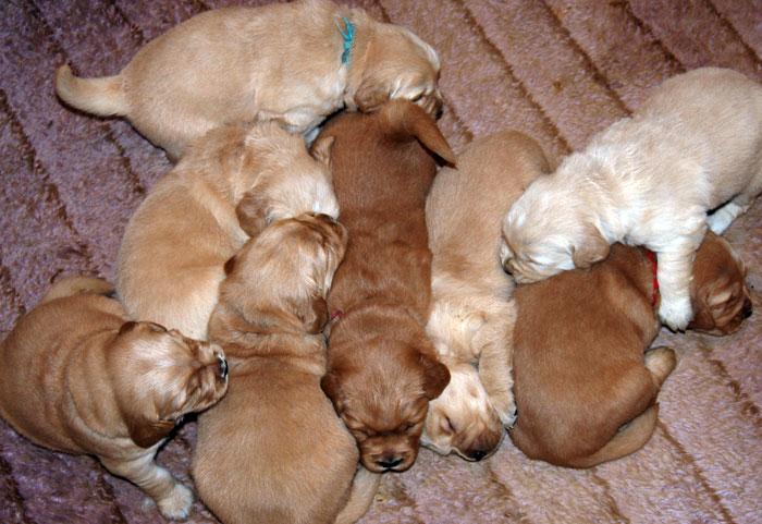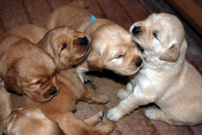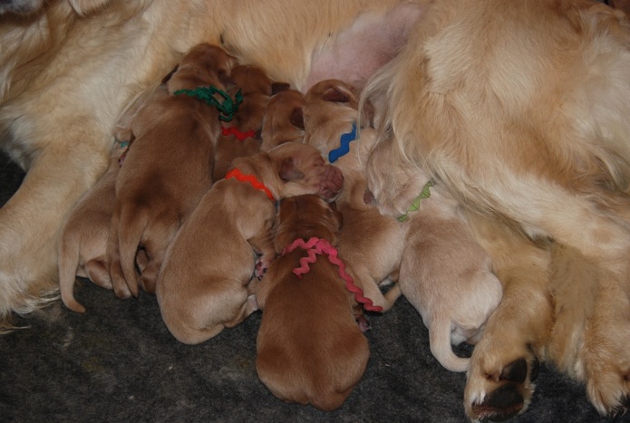 These pups are here and look wonderful. There is a real rainbow of colors from dark to light. Love these type of litters! The pups are growing well and are plump and healthy. Beautiful heads and lots of bone. I expect these puppies to be very friendly, good retrievers that are medium in activity level.