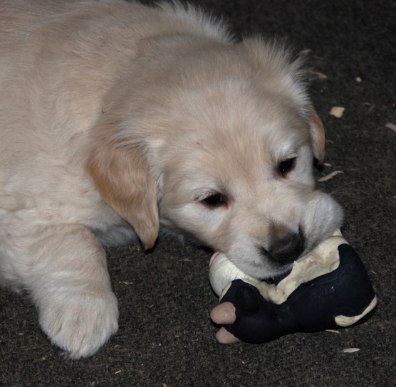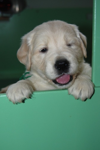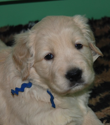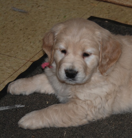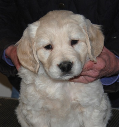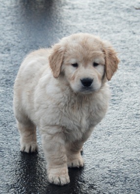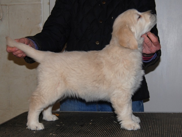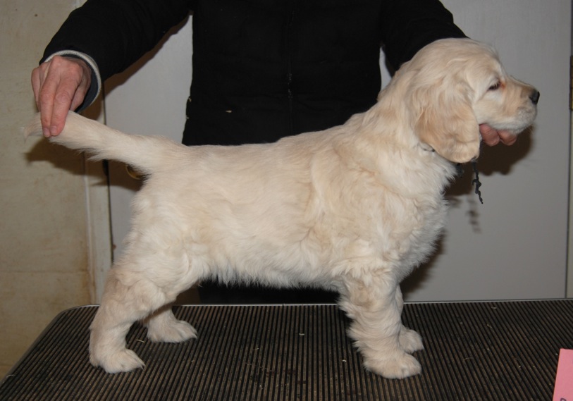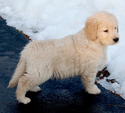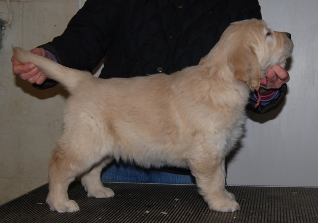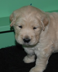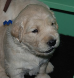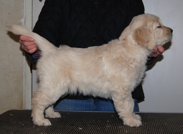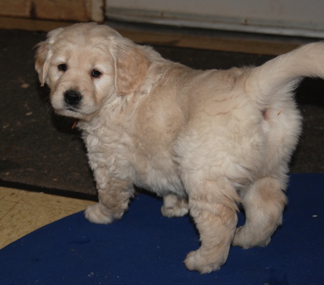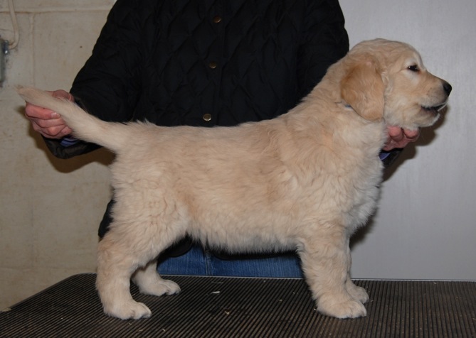 Ready (CH Chantelle On Your Mark) is a beautiful blonde boy with wonderful temperament and movement. He is betwween 23 1/2 and 24 inches tall. He is a super blend of American and European style golden retrievers. Ready is producing beautiful talented kids. One just finished his Grand Championship. Ready is quite a gentleman and he totally charmed my husband (not easy to do!)