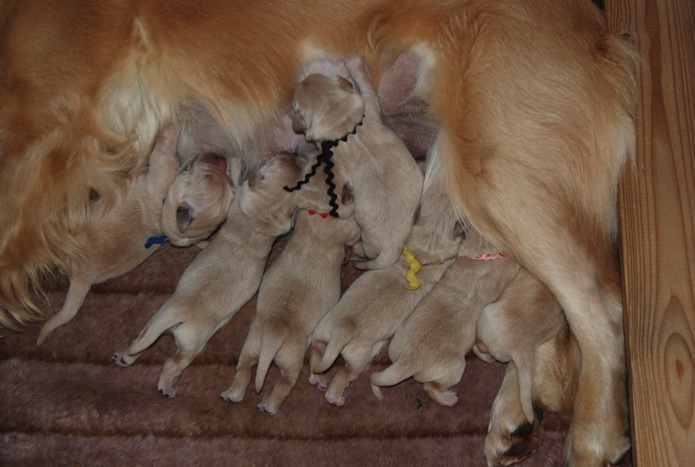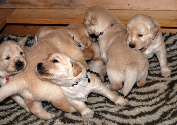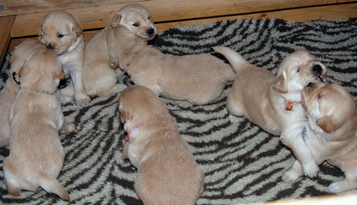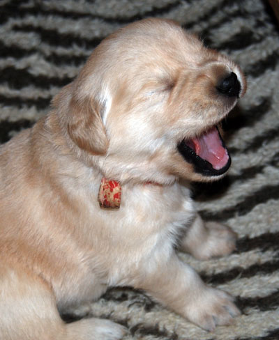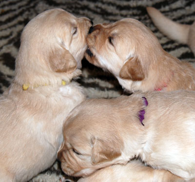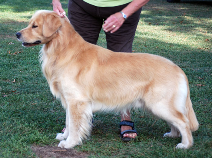 Roger has been throwing wonderful puppies with great structure and disposition. I was so pleased with the first three litters he sired for us, he has been chosen to sire Rita's first litter. My boy, CH Lycinan's Good Sport CD, is sired by Roger. Roger's puppies have been wonderfully good natured, love to swim, very handsome and most of all - healthy. This breeding is very similar to that which produced Sport.