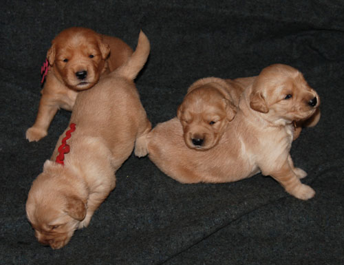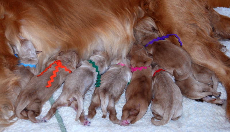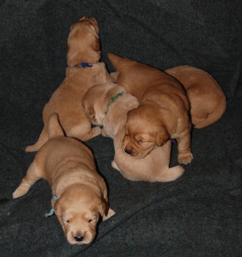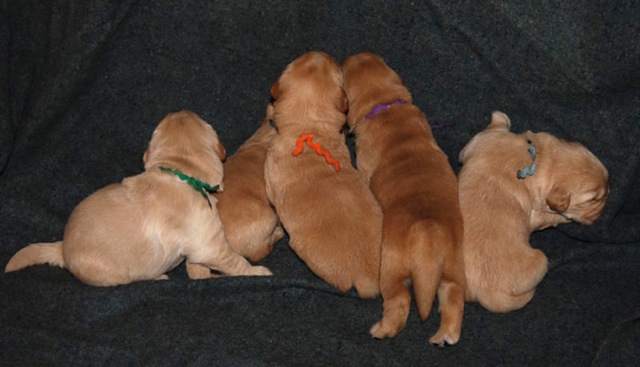 Pups are getting fat and sassy! There is one dark boy and one dark girl. The rest are various shades of medium. Green boy is fairly light. The color in the photos is somewhat deceptive and dependant on your viewer.
