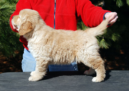 Tucker is moderate in size, measuring 23 3/4 inches and 75 pounds. He has a lovely, well proportioned head, strong topline and lovely rear. He is honey colored with ligher feathers. Tucker's coat is very easy to care for, whether following a swim in the lake or getting ready for trial. He is VERY athletic and energetic, clearing the agility jumps with inches to spare. He handles his body beautifully, always with great co-ordination. He is and extremely solid dog.